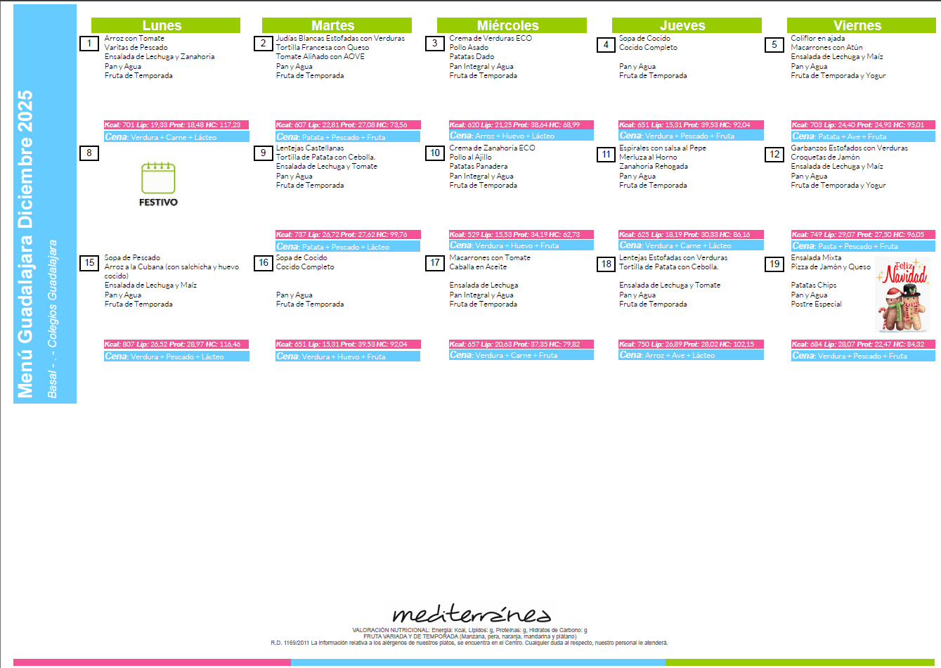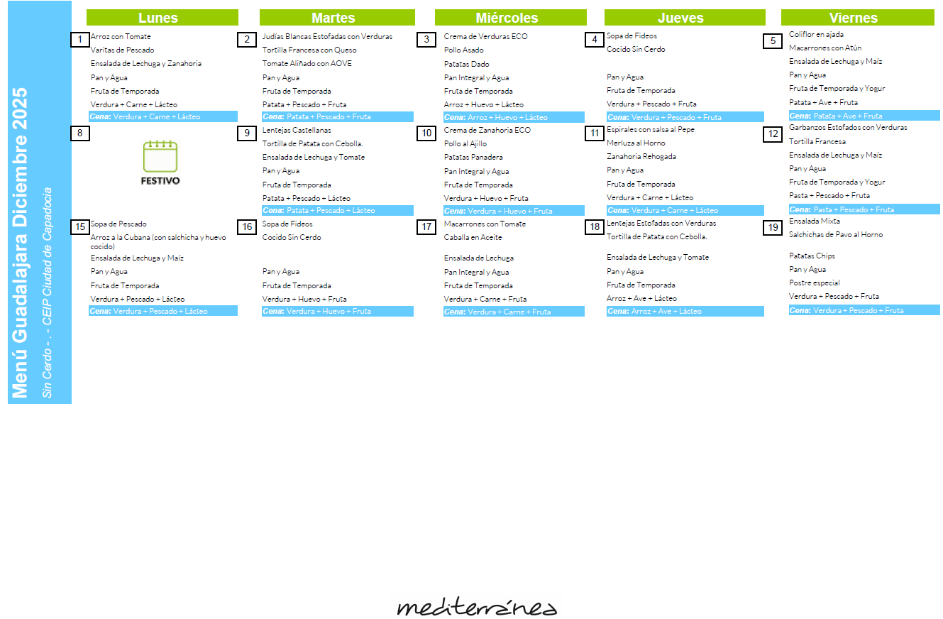 Este es el menú del mes de diciembre para el comedor.
